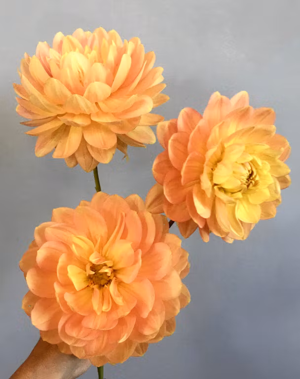 Stora mycket välformade blommor i persiko-gul-orangea toner gör denna näckrosdahlian med sina kupade och lite skålformade blommor mycket eftertraktad både av förädlare och som trädgårdsblomma. Vi har mycket begränsat antal av denna sort tillgänglig eftersom den nyligen klarade karantänen hos oss och visade sig vara frisk från bakterier & virus efter import från England och därför har vi inte hunnit odla upp den i större kvantiteter till försäljning ännu.